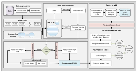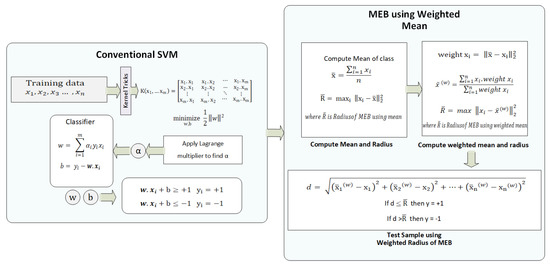 The mathematical model of WR-SVM is illustrated in Figure 10. First, the data are pre-processed and divided into k-folds, as discussed earlier. The processed data are passed to conventional SVM by selecting the kernel function, which changes the datas’ dimension. Lagrange Multiplier [48] is used to find the value of , which is used to find the value of w and b in the next step. The classifier values i.e., w and b are used to classify the test data, as shown in (2) and (3). Next, the radius of MEB is computed in three steps. Firstly, the mean of each class is computed, and the radius according to F-SVM is computed. Secondly, the distance of each sample from the mean is computed, which is used as the weight of that sample. The weights are assigned to each sample, and the weighted mean is computed. From the weighted feature space, again, the radius is computed. The radius which is computed from the weighted feature space is minimized. For the test samples, first, w and b are used to predict the class of samples, and after that distance of that test, the sample is computed from the weighted mean of the sample. If the distance is less than the radius of class, i.e., , then the sample belongs to and in other cases.