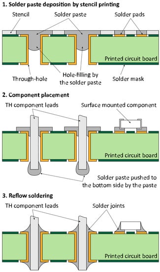 With the rapid development of complex printed circuit boards for advanced applications, electronics components have become smaller, on the one hand, and pin-in-paste technology has come into focus, on the other hand. Pin-in-paste technology provides an advanced assembly method for complex electronic assemblies, where both the surface mounted (SM) and the through-hole (TH) components are assembled at the same time by reflow soldering technology [1]. The steps of the pin-in-paste technology are the same as that of the reflow soldering technology: (1) depositing the solder paste onto the soldering pads and into the plated through-holes of the printed circuit board by stencil printing; (2) placing the electronic components (also the TH components in this case) into the deposited solder paste; (3) soldering the components by transporting the printed circuit assembly through a reflow oven, in which the thermal profile is carefully adjusted by setting the proper temperature of individual heating zones (Figure 1).