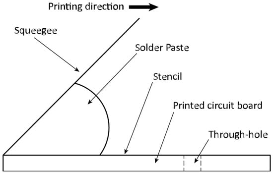 Optimizing the stencil printing process can improve both the quality and the reliability of solder joints [3]. During the optimization, parameters affecting the process shall be considered, such as the rheological properties of solder paste, the printing speed, and the geometry/orientation of apertures and plated holes for SM and TH components, respectively [4,5]. Many research works have proven the correlation between the paste properties and the transfer efficiency of the printing [6,7]. The transfer efficiency characterizes the amount of solder paste deposited onto the soldering pads and into the plated through-hole of the printed circuit board. Solder pastes have shear-thinning properties, aiding the flow into the plated through-holes. Solder pastes also have a thixotropic nature for recovery, which allows them to be fixed in the through-holes until the components have been inserted [8].