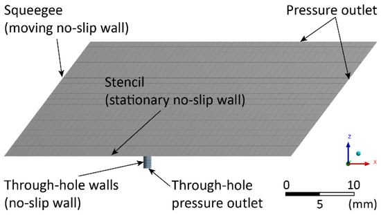 The transient, two-phase model was built using ANSYS Fluent. In the model, the air and the solder paste were considered incompressible. The two-phase model was based on the Volume of Fluid (VOF) method. The movement of the squeegee was addressed by the dynamic meshing method, using the bottom layering technique. The following boundary conditions were applied in the transient model: No-slip wall boundary conditions were applied at the stencil, the squeegee, and the sidewalls of the through-holes. The other walls possessed pressure outlet condition (Figure 3).