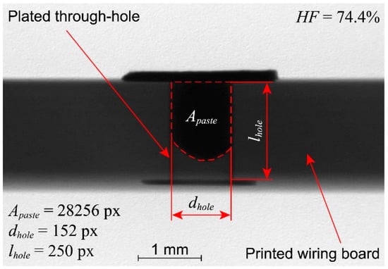 The model was validated by comparing calculated hole-fillings (for various hole diameters and printing speeds) to measured hole-fillings. For the hole-filling measurement, a 1.55 mm thick printed circuit board was designed, which included through-holes with different diameters (0.8, 1.0, 1.1 and 1.4 mm), and solder paste was deposited by stencil printing using different printing speeds (from 20 to 70 mm/s). The solder paste used was a Type-4 (particle size range is 20–38 µm) lead-free paste, manufactured by KOKI. The composition of the alloy in the paste was SAC305 (Sn/3Ag/0.5Cu in wt%). The solidus and liquidus points of this alloy are 217 and 220 °C, respectively. The density is 7380 kg/m3, and the (as cast) yield strength and ultimate tensile strength are 26–31 and 30–39 MPa, respectively [23]. The hole-fillings were measured by determining the ratio between the projected area of the solder paste and the projected area of the through-holes in side-view X-ray images. In Figure 4, for example, the projected area of the solder paste is 28,256 px, and the projected area of the through-hole is 38,000 px (152 · 250), resulting in a relative hole-filling of 74.4%.
