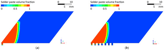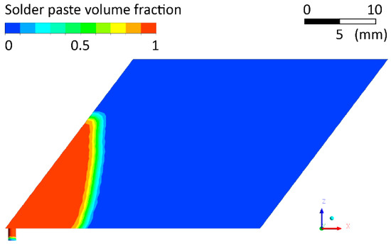 Since the heat generated by the moving solder paste is negligible [22], the model was isothermal. Gravitational acceleration was considered as 9.8 m/s2. The dynamic meshing parameters were as follows: the split factor = 0.4, collapse factor = 0.2, cell height = exact value of meshing element size, and the implicit update was activated. The mesh size was optimized by grid analyses and validated by an empirical approach (Section 2.2). The final mesh element size for the fluid area and through-hole was 900 and 200 µm, respectively.