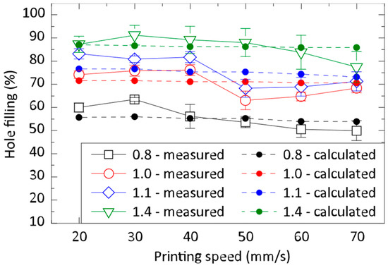 Hole-filling as a function of rectangular-shaped through-holes at different printing speeds (note that the dimension of the holes in z-direction was 4 mm).
