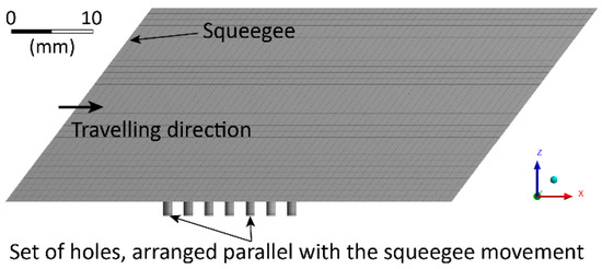 Numerical model, where the through-holes are arranged in parallel with the travelling direction of the squeegee. The seven consecutive through-holes are distributed evenly at distances of 2.54 mm.