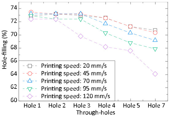 As expected, there was no interaction between the holes, and the hole-filling was the same for all through-holes when they were arranged perpendicular to the travelling direction (in parallel with the line) of the printing squeegee. However, an interaction between the holes was found when they were arranged in parallel with the direction of the squeegee movement. A clear and gradual reduction in the hole-filling was observed, which became more intensive at higher printing speeds. The differences in hole-filling between the first and the seventh hole were 2.4% and 9.2% for the printing speeds of 20 and 120 mm/s, respectively (Figure 8).