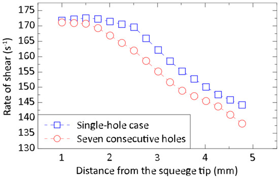 The hole-filling was analyzed further to find a possible explanation for the differences in the filling. The rate of shear during the printing within the solder paste was analyzed by comparing the cases of having one single hole or seven consecutive holes (Figure 9—the printing squeegee travelled till the first through-hole). It was found that placing the holes after one another disturbs the flow-field, and the rate of shear is lower (by up to 5–6%) on the stencil surface compared to the case utilizing a single hole (Figure 10).