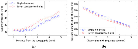 Comparing the cases utilizing a single hole or multiple holes in the printed wiring board (printing speed was 120 mm/s): (a) dynamic viscosity of the solder paste; (b) pressure along the line of the stencil.