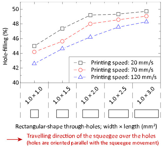 The effect of hole shape on the hole-filling was also investigated. Oblong-shaped through-holes were analyzed by utilizing rectangular-shaped holes in the numerical model. Five different shapes were investigated, and the linear dimensions of the holes were varied at 1.0 × 1.0, 1.0 × 1.5, 1.0 × 2, 1.0 × 2.5, and 1.0 × 3.0 mm (Figure 12). The holes with different shapes were also oriented in two directions: perpendicular to and in parallel with the travelling direction of the printing squeegee. Note that the dimension of the through-holes in z-direction was increased from 1.55 to 4 mm, since in the case of larger holes (e.g., 1.0 × 2 mm), a filling larger than 1.55 mm was expected. The filling of rectangular-shaped through-holes was investigated at three different printing velocities (20, 70, and 120 mm/s).