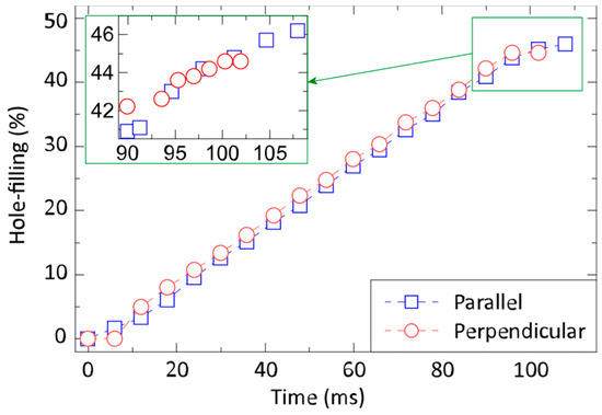 The dynamics of hole-filling were analyzed and compared between the cases of orienting a through-hole perpendicular to or in parallel with the travelling direction of the printing squeegee. It was found that the through-holes were filled almost linearly over time (Figure 13). However, the pressure on the solder paste increases exponentially as the squeegee travels over the through-hole [10,11]. The amount of solder paste also gradually increases in the hole, introducing resistance against the filling and resulting in almost linear fill-dynamics. This implies that the hole-filling depends mainly on time spent by the printing squeegee over the through-holes (considering identical process and material parameters). Therefore, larger hole-filling is expected if the rectangular- or oblong-shaped through-holes are oriented in parallel with the travelling direction of the squeegee. Similarly, gradually larger hole-filling is anticipated if the linear size of the holes is extending in parallel with the squeegee movement. The orientation of oblong-shaped through-holes can be designed according to the solder paste requirement for a specific component lead geometry. If the component leads are smaller for a particular oblong-shaped through-hole, thus requiring more solder paste to form appropriate solder joints, the respective through-holes should be oriented in a parallel direction with the squeegee movement. If the lead sizes are larger, the through-holes can be oriented perpendicular to the squeegee movement.