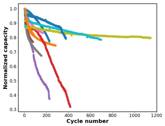 - Severson, K.A.; Attia, P.M.; Jin, N.; Perkins, N.; Jiang, B.; Yang, Z.; Chen, M.H.; Aykol, M.; Herring, P.K.; Fraggedakis, D.; et al. Data-driven prediction of battery cycle life before capacity degradation. Nat. Energy 2019, 4, 383–391. [Google Scholar] [CrossRef]