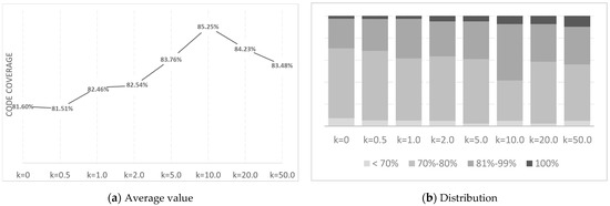 It is also interesting to consider the distribution of different degrees of code coverage, as shown in Figure 1b. As you can see, for a larger number of k, the largest share of coverage falls into the group from 70% to 80%. Only for k = 10, the largest share falls into the 81–99% group. Further, it can be noted that for k = 20 and k = 50, in general, the distribution worsens compared to k = 10 (although the share of variants with 100% coverage is higher, the share with low coverage also increases).