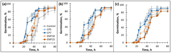 Germination dynamics of control and treated seeds of red clover—yellow (a), brown (b), and dark purple (c) seeds. Mean values of three replicates ± standard error are presented. The number of seeds in each replicate was 50 (n = 3).