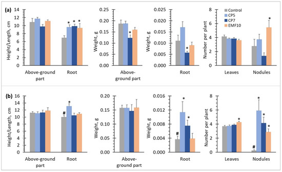 Treatments did not change the height of the above-ground part of seedlings growing from dark purple seeds (Figure 4b), but in contrast to seedlings from yellow seeds, CP7 and EMF10 did not affect the root length, and only CP5 increased it by 31%. Seed treatments did not affect the weight of the above-ground part of the seedlings from dark purple seeds (Figure 4b), but the root weight increased several folds in CP treatment groups (3-fold and more than 2-fold in CP5 and CP7 groups, respectively) compared to control. EMF10 did not change the root weight but increased the number of leaves by 16% (Figure 4b). Seed treatments exerted a strong positive effect on the number of nodules: CP5 increased the number of nodules by 27, CP7 by 19, EMF10 by 13 times (Figure 4b). As a result, the mean number of root nodules in dark purple seed seedlings in the CP7 group was 3.3 times larger compared with the number of nodules in the roots of CP7-treated yellow seed seedlings (p < 0.05), while the difference between seedlings grown from differently colored seeds exposed to CP5 treatment was not statistically significant. Thus, CP treatments strongly improved nodulation in seedlings grown from dark purple seeds. EMF10 treatment had a strong positive effect on nodulation activity in seedlings grown from seeds of both colors, but the number of nodules in yellow seeds seedlings was 1.76 times larger compared to dark purple seed seedlings (p < 0.05).