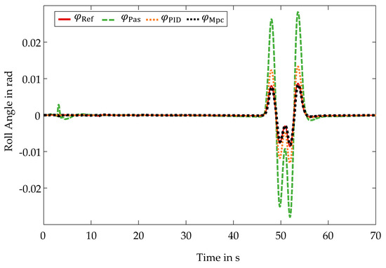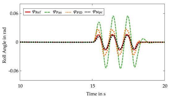 To evaluate the control quality of the central predictive control with a focus on the active roll stabilization, the roll angle curves during the sinusoidal steering are plotted. The present roll angle curves are shown in Figure 9.