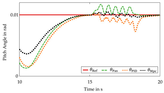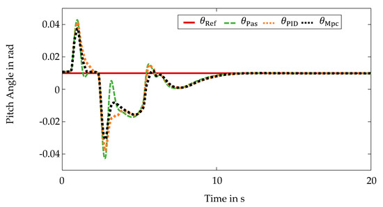 Similar to the manipulation of the self-steering behavior, the reduction of pitching movements is a subordinate control objective within the non-linear model-based predictive control algorithm. Due to the vehicle’s equipment with active stabilizers and semi-active dampers, only a limited influence on the pitch behavior is possible. In order to evaluate the central predictive control in a qualitative way with respect to the control objective of reducing the pitching movements, the pitch angle is plotted over time. The pitch angle curves are shown in Figure 7.