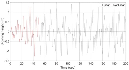 - The time history of the sloshing height from the nonlinear analysis is nearly identical to that from the linear analysis. This is due to the fact that the convective mode of the fluid motion is adequately separated from its impulsive mode. Therefore, the material nonlinearity in the structure has negligible effects on the sloshing height.