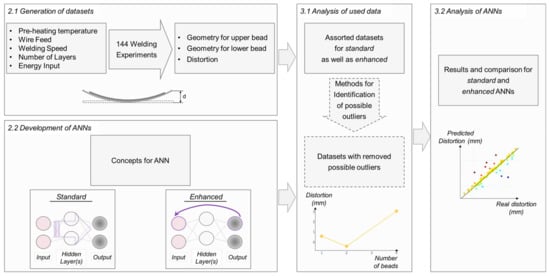 Other approaches include looking at specific operations for welding processes, such as the joining of metal plates with a focus on the resulting distortion [22] or optimization of welding parameters for special purposes such as thin-walled aluminum structures [23]. Tian et al. and Tafarroj et al. examined the possible resulting plate geometries as well as distortion for the substrate for single beads [24,25]. Thus, according to prior research, the prediction of the resulting bead height and width, as well as distortion, is a viable application for ANN. However, the applicability of the current approaches towards different experimental setups or different real-life implementations within a reasonable timeframe is questionable. Distortion is often affected by the welded geometries and related factors such as wall thicknesses which requires geometry-specific adjustments to the ANNs and the machine-learning algorithms. This is not efficient for small to medium scale process chains such as IM, where these welded additive processes must be predictable in order to efficiently design the process timelines. In particular, predictions for possible occurring geometry deficiencies such as deviations in component heights lead to better planning, or with countermeasures taken during the process, to a decrease of manual intervention and an overall increase of efficiency. The current state of the art shows that prediction is generally possible and examines potential training processes and data acquisition solutions. However, the next steps towards larger-scale applicability for different welded structures and components with few predefined parameters or pre-programmed FEM-models require further research.