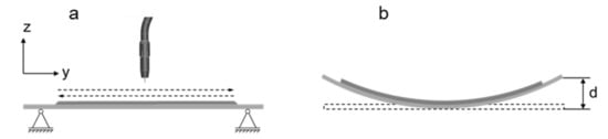 During welding and subsequent cooling sequence, the specimens were positioned using a floating bearing arrangement without clamping, allowing free deformation (see Figure 2a). This arrangement was chosen to solely consider the welding distortion under idealized conditions without influences of the clamping conditions. Three stops were used for repeatable positioning of the specimens on the welding table. Only minor deviations of the position in the x–y plane were detected due to the distortion of the samples. Deviations in the z-plane resulted in a change of the contact-tip to workpiece distance along the predetermined weld path. Based on the measurements of welding voltage and current, these showed no significant influences on the deposition process. For the determination of the energy input per layer, welding voltage and current were measured using a weld process data scanner (HKS Prozesstechnik GmbH, Germany) and integrated over the welding time. Welding distortion has three primary components in x, y, and z directions. This study is focused on the main distortion in the y–z-plane as distortions in x-z-plane were found to be considerably low. The distortion in the y–z-plane (Figure 2b) was measured after cooling the sample using a dial gauge. For the measurement procedure, the sample was positioned on a measurement table with the curvature from distortion facing upwards. Further, the distortion was determined as the highest point (minus sample thickness) at four points along the x-direction using a dial gauge.