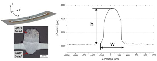 Further, the resulting weld bead geometries respective build-up height and width were measured in the x–z-planes with a laser scanner, as depicted in Figure 3. Measurements were done on both sides, on the top side, referred to as upper weld bead in this study, as well as on the underside of the plate, called lower weld bead or weld root, in the following paragraphs, respectively.