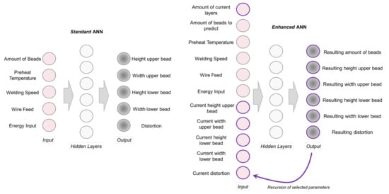 As a second type of ANN architecture, an enhanced procedure is chosen. This can also be described as a recursive concept, where the geometries and distortion from previous welds on the plate are used as an additional input. This means, that for continuous prediction, the ANN is able to partially reuse previous outputs as inputs. For this approach, there is always a given pre-distortion, which is used in combination with the welding parameters to predict the distortion after the next welded segment, which can consist of one or multiple beads. These two types of ANN are visualized in Figure 4 and serve as a basis for the further examination in this paper.