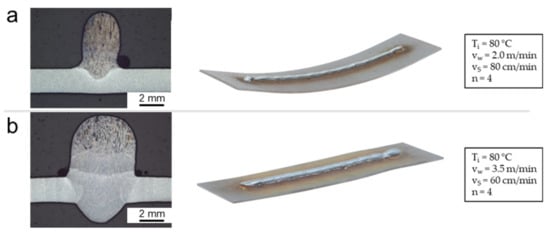 Weld seam geometry and resulting sample distortion for different parameter combinations: (a) low energy input, (b) high energy input.
