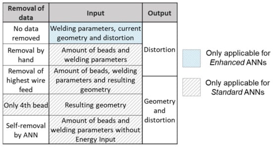 Before starting to build and train these ANNs, concepts for the implementation of the in- and output values are developed. The first type of architecture for an ANN is to use the actual welding parameters as the input. These parameters can be directly influenced by the welder and are displayed in the first five columns of Table 3. The corresponding outputs are the five columns on the right, which are the resulting geometry as well as the distortion. Geometry, in this case, indicates the height and width of both the lower and upper bead. These standard ANNs are only applicable for undistorted “blank” substrates, as it has no way of being informed about a previous distortion with this input data.