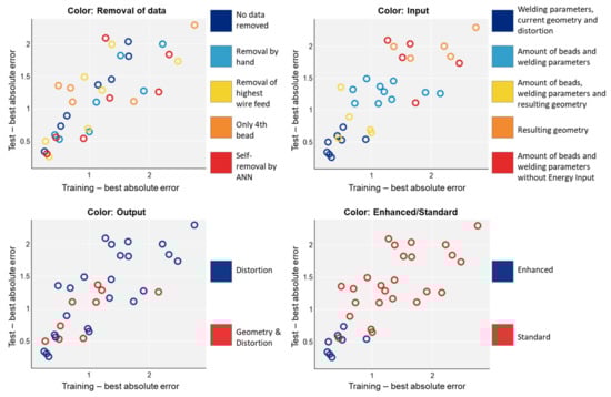 In the diagrams of Figure 11, the error of the predicted distortion to the actual distortion is shown by the color of the dots. No particular areas that tend to result in large errors were identified. Merely the areas with low current lower weld bead height can be described as the area with all of the larger errors. However, in the same area, a very large amount of predictions with a low error are also existent, so the relative amount of large errors remains low. In summary, this concept for an enhanced ANN promises to deliver very good results even for the edges of available data.