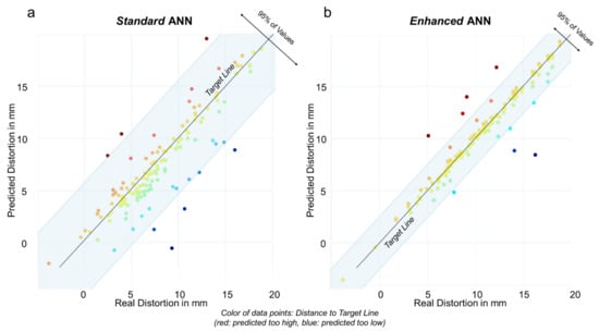 All test and training data were plotted. The target line indicates the values for a perfectly accurate prediction. In both diagrams, the prediction dots were scattered very closely along this line, which proves an accurate prediction model for the created ANNs. In comparison to each other, the enhanced ANN scatters less, which is also supported by the minimum and maximum errors of (4 mm/−7 mm) for the enhanced ANN as well as (6 mm/−9 mm) for the standard ANN. Groups of large errors cannot be clearly assigned to an area of real distortion. Hence, the ANN should work well for all examined distortion values. The prediction also does not result in data points scattered more on one side of the target line, which means that there is no imbalance, such as a shifted prediction towards high distortions.