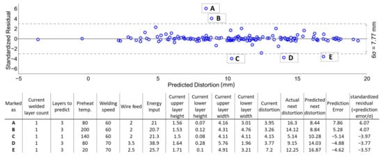 Even though there are some outliers surpassing an upper and lower limit of three times the standard deviation, this plot visualizes the good fit of this enhanced approach, as over 95% of datapoints are within these boundaries. The standardized residual is even lower for most points, with the average of the absolute standardized residual being 0.485. The five outliers are listed at the bottom of the figure. The low amount of outliers compared to the total amount of 144 datapoints only allows very limited statements about their nature. The only obvious common ground is a current welded layer count of one, which suggests that the ANN is mostly challenged by the prediction of early layers. As noted in Section 3.2, these outliers appear in a broad area where the bulk of the predicted data points are also located. In summary, Figure 10 confirms low prediction errors even for predictions of high and low distortions and an overall ability to predict all trained ranges of parameter values for this preliminary application of an enhanced approach.