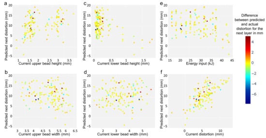 Visualization of the influence of inputs on the accuracy of distortion prediction with an enhanced ANN with unedited data from the input of all welding parameters, current geometry and distortion and output distortion. Plotted is the predicted next distortion over (a–d) current upper and lower bead geometry, (e) energy input and (f) current distortion.
