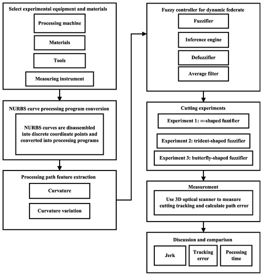 In this study, cutting experiments are performed with three shapes: ∞-shaped, trident-shaped, and butterfly-shaped curves. First, the machining shapes are disassembled into discrete coordinate points and converted into processing programs, next, the machining programs extract features from the curvature and curvature variation. After obtaining the required characteristic values, input those values into the fuzzy controller for feed rate scheduling to obtain the feed rate. Subsequently, an average filter is used to adjust the final feed rate and input the final feed rate in the machining program for actual cutting. Finally, the cutting workpiece is scanned with an optical three-dimensional scanner and the cutting path error is verified. Figure 1 shows the experimental procedure of this study.