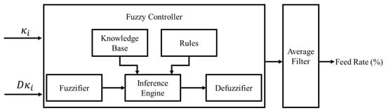 The proposed fuzzy control for dynamic feed rate scheduling has two input dimensions: current curvature () and amount of curvature variation (). After fuzzy inference, the current feed rate can be obtained by defuzzification, and all calculated feed rates are input into the average filter to obtain the machining feed rate. Figure 4 shows the architecture of the fuzzy controller for dynamic feed rate.