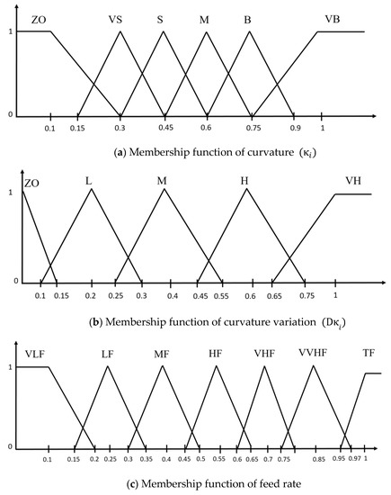 Some common fuzzy membership functions include many different types, such as triangles, trapezoids, and Gaussians. In the past literature, it is pointed out that the use of the Gaussian membership function can obtain better experimental results. Compared with the triangular membership function, the use of the Gaussian membership function requires more computing resources and time. Therefore, in this study, we adopted the triangular membership function to define the input and output membership functions. The first input is the curvature membership function where ZO is the minimum curvature, VS is the very small curvature, S is the small curvature, M is the medium curvature, B is the large curvature, and VB is the maximum curvature. The other input is curvature variation where ZO is the very small change, L is a small change, M is a medium change, H is a large change, and VH is an extremely large change. For the output feed rate membership function, VLF is extremely slow speed, LF is slow speed, MF is medium speed, HF is high speed, VHF is very high speed, VVHF is extremely high speed, and TF is the highest speed. Figure 5 shows the membership functions of the curvature, curvature variation, and feed rate.