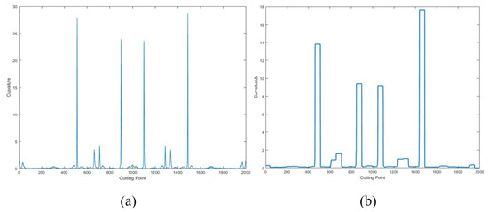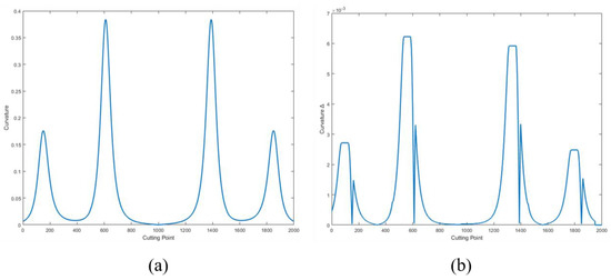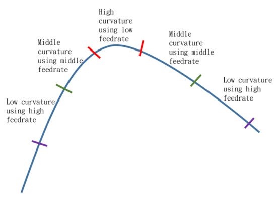 Many researchers [9,19] showed that the curvature has a great relationship with the machining path error as well as feed rate. Therefore, using a lower feed rate in the machining segment with a larger curvature can effectively reduce the machining path error; however, most scholars used the current curvature as the design method for dynamic feed scheduling. With this method, it is easy to cause excessive acceleration and deceleration in a machining algorithm with uneven curvature distribution. Thus, this study adds the curvature variation as the second condition to enable the dynamic feed scheduling to perform better acceleration and deceleration.
