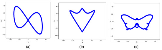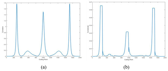 The ∞ shape, trident shape, and butterfly shape graphics [18,20], represented as NURBS graphs in Figure 7a–c, respectively, are used in the cutting experiment. The sizes of those shapes were shrunk to fit into the aluminum workpiece for cutting experiment in addition 2000-point coordinates are generated by a resolution of 0.0005, and the curvature and curvature variation are extracted through the machining path. Figure 8, Figure 9 and Figure 10 show the curvature and curvature variation of the ∞ shape, trident shape, and butterfly shape, respectively.