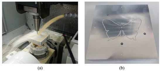 To ensure all the shapes are engraved with the same depth, each aluminum 6061 alloy workpiece will be face-processed before cutting. Furthermore, to prevent the tool from bending, the depth of cut is set to 2 mm. Figure 11a shows the cutting process of an aluminum workpiece, and Figure 11b shows the aluminum workpiece after cutting.
