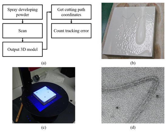 Figure 12a shows a flowchart of optical three-dimensional measurement. First, the surface of the aluminum workpiece can easily refract light; therefore, a developer for measurement must be sprayed before optical measurement, as shown in Figure 12b. Figure 12c shows the scanning with the optical 3D scanner to obtain the geometric features of the workpiece. Figure 13 shows the software output as a binary 3D graphics file. After obtaining the 3D graphics, the deepest coordinate point of the cutting path groove is acquired as the tool tip cutting path. This coordinate is matched to the path of the original machining program, and the shortest distance is calculated as the path error, as shown in Figure 13.