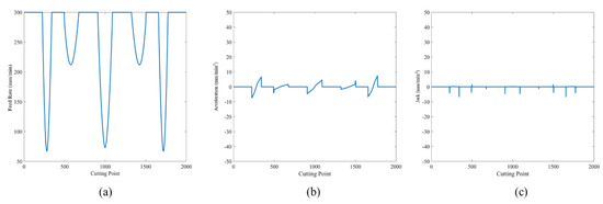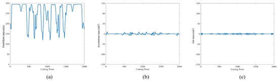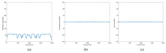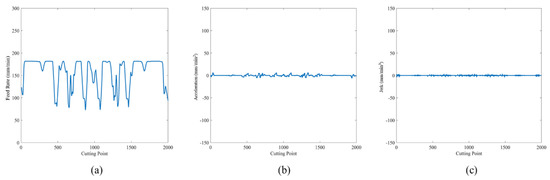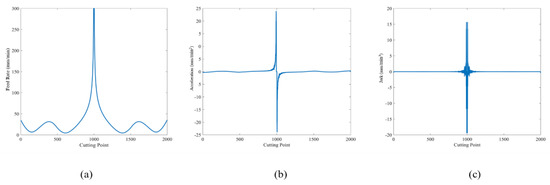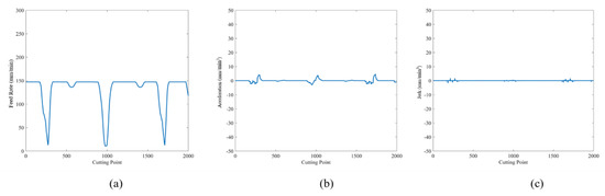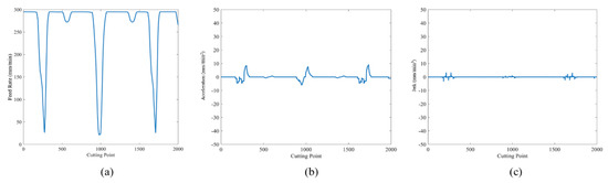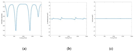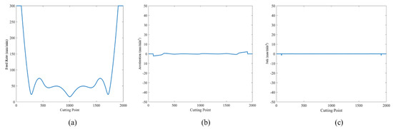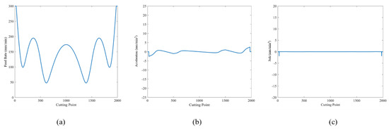 Cutting butterfly shape using method by Giannelli et al. [11]: (a) feed rate, (b) acceleration, and (c) jerk.