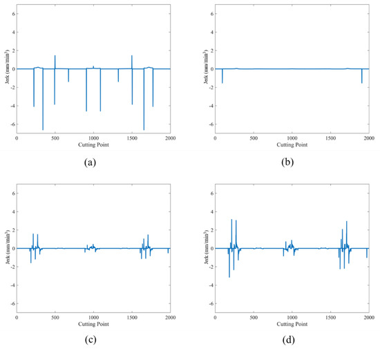 Jerk when cutting trident shape using (a) method by Luan et al. [9], (b) method by Yeh and Hsu [10], (c) our method with maximum feed rate of 150 m/min, and (d) our method with maximum feed rate of 300 mm/min.