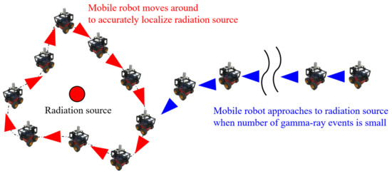 There have been some cases in which radiation sources were stolen. In Georgia, five suspects were arrested for the illegal trade of radioactive uranium [1]. Accordingly, illegally traded radiation sources possibly fall into the hands of terrorist organizations, and are harnessed to create dirty bombs comprising explosives and radiation sources, or silent source attacks that leave high-dose radiation sources to harm humans. In addition, radiation sources can cause great damage when used in urban areas or important facilities. However, the detection and removal of radiation sources currently relies on human workers, even though it is extremely dangerous to approach and investigate these sources [2]. Owing to the high risk of exposure to radiation, it is necessary to develop a radiation source exploration system with mobile robots in urban areas and various facilities [3,4].