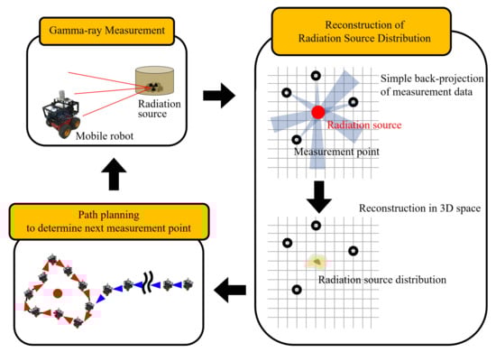As an alternative to the aforementioned techniques, gamma camera-based searching, which allows for determining the incident gamma ray direction, has been studied. Kim et al. proposed a method for three-dimensional (3D) reconstruction of the radiation source distribution in an environment using a mobile robot equipped with a Compton camera [10]. Shikaze et al. proposed a method for estimating the radiation source distribution using an unmanned helicopter equipped with a Compton camera [11]. However, these techniques are based on a predefined path. Search path planning using a gamma camera has not been extensively studied. Because high-dose radiation sources exceeding 5 Sv can cause significant damage to the human body, it is necessary to detect and eliminate it at an early stage. Therefore, an investigation that sequentially scans the entire environment is ineffective when the target environment is large.