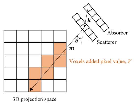 Simple back-projection method: let be the vector connecting the interacting elements on the absorber and scatterer layers, and the vector connecting the interacting element on the scatterer and the voxels in projection space. The pixel value of the voxels, depicted in orange, can be calculated using the delta function in Equation (2).