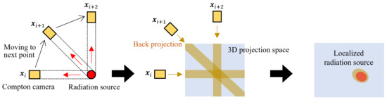 After the gamma-ray measurement, the reconstruction of the radiation source distribution to a 3D space is conducted based on the measurement results. The proposed system applies a simple back-projection method, which is a general reconstruction method. Details on the reconstruction of the radiation source distribution are provided in Section 2.3.