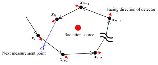 where A represents the constant distance that the mobile robot moves in one step. The distance moved in one step is tuned according to the target area size and the inspection urgency. If the target area is large and the inspection must be completed in a short time, the step size is determined to be a large value. However, this can reduce the localization accuracy. Conversely, if the target area is small, the inspection is not urgent, and high localization accuracy is required, a smaller step size value is determined. The value is set once before the inspection begins. This process is repeated, and path planning is only completed when the loop is closed, as illustrated in Figure 7. Path planning is implemented as described in Algorithm 2. The next measurement position is determined based on the measurement at the current position, and the previous measurements do not affect the next measurement point. Notably, there are sign ambiguities in both eigenvectors, and . The sign of is defined such that the robot moves toward the radiation sources. Meanwhile, the selected direction of is irrelevant as long as the same direction is kept during the path planning. Additionally, because the detector is fixed on the mobile robot, it can only rotate with respect to the Z axis. Consequently, the detector faces the movement direction of the robot, as shown in Figure 7. The red arrows represent the direction that the detector faces; the aforementioned direction at position is determined to be along .