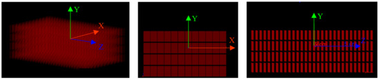 All-around view Compton camera implemented in Geant4: the camera consists of a 12 × 4 × 30 array of CdTe detectors. The red, green, and blue arrows represent the X-, Y-, and Z- axes, respectively.