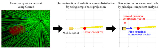 Generally, the lower the distance to the source, the shorter the time required to obtain the same radiation counts measured by the detector. Therefore, if the number of gamma-ray measurement events is insufficient at the current position, a mobile robot is required to approach the radiation sources until the number of events reaches a sufficient value. Moreover, to accurately localize the radiation sources, it is necessary to follow a path that surrounds them. Hence, the proposed method is designed to generate a path that surrounds the radiation source after approaching a distance where a sufficient number of measurement events can be obtained. The proposed method applies PCA to generate this path based on the reconstruction results of the radiation source distribution, which is constructed by simple back-projection. Comprehensive details on path planning are presented in Section 2.4.