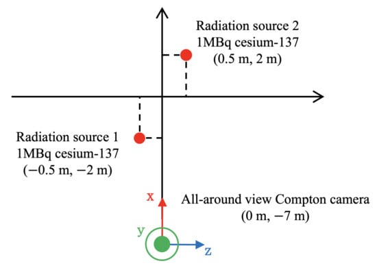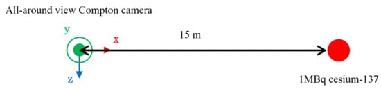 A simulation experiment was conducted by arranging a single radiation source, which can be regarded as a point source, as illustrated in Figure 10. We positioned 1 MBq of cesium-137 15 m from the all-around view Compton camera. The threshold for switching the principal component vector was set to 400. Triplets and higher multiplicities of Compton events were not considered; only Compton event pairs were considered. The moving distance of the mobile robot at each time step between the measurement points was set to 5 m. The measurement at each point was performed for 60 s, and the robot stopped during the measurement. The background radiation was not considered.