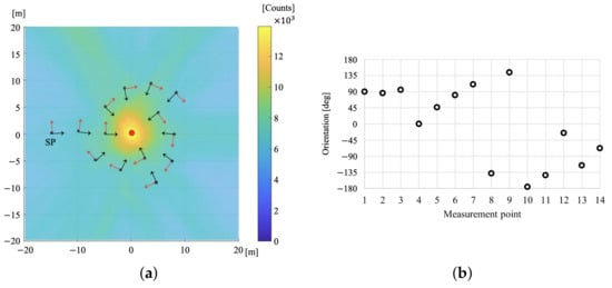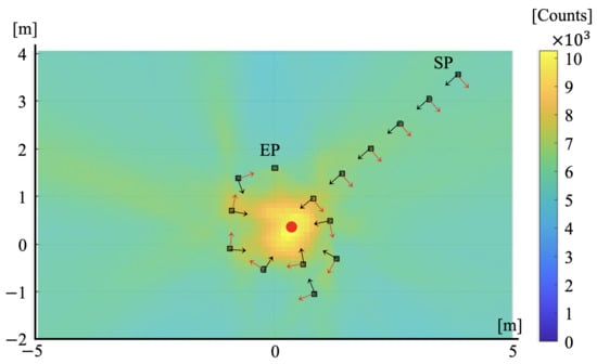 Figure 11a illustrates the simulation result. SP represents the first measurement point where the robot started to move, while EP is the position at which the gamma-ray measurements were completed. The color bar on the right represents the value added to each pixel. The black and red arrows represent the directions of the first and second principal components, respectively. The ground truth of the position of the radiation source is represented as a red dot. The detector was fixed on the mobile robot; therefore, the detector orientation at position was determined along the robot’s movement direction, i.e., . Figure 11b shows the detector orientation during the inspection. The detector orientation was zero when the X axis was facing upward, and clockwise rotation was defined as positive.
