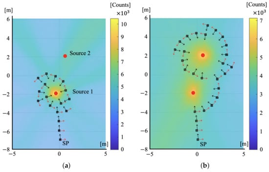 A simulation experiment was conducted in an environment in which multiple radiation sources were dispersed. In this case, the location of each radiation source should be specified. Figure 13 presents the simulation conditions. Two radiation sources were placed in two locations: (−0.5 m, −2 m) and (0.5 m, 2 m). Two 1 MBq cesium-137 radiation sources were used. Then, the robot was positioned 7 m from the origin of the coordinates.