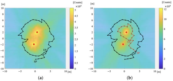 To address this challenge, additional simulations were conducted under the same conditions. In the initial stage, the robot moved and measured gamma rays with the threshold set to 1000. The movement distance of the mobile robot at each time step between the measurement points was set to 1 m. Figure 15a presents the determined path and the reconstructed distribution map with the proposed method in the initial stage. The red dots denote the two radiation sources, and the black line represents the determined path with the proposed method. It was confirmed that a path primarily surrounding the two radiation sources was generated. By setting a small threshold value, measurement points away from the sources were determined. It was confirmed that two location around the sources showed high values; however, there was no clear distinction between these locations.